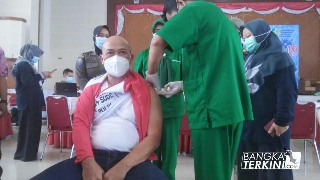 BANGKA TERKINI - BANGKA TENGAH ---- Wakil Bupati Bangka Tengah, Herry Erfian vaksinasi lanjutan yang ke Dua bersamaan dengan para pelayan publik, bertempat di GSG kecamatan Koba. Kamis, (18/03/2021).