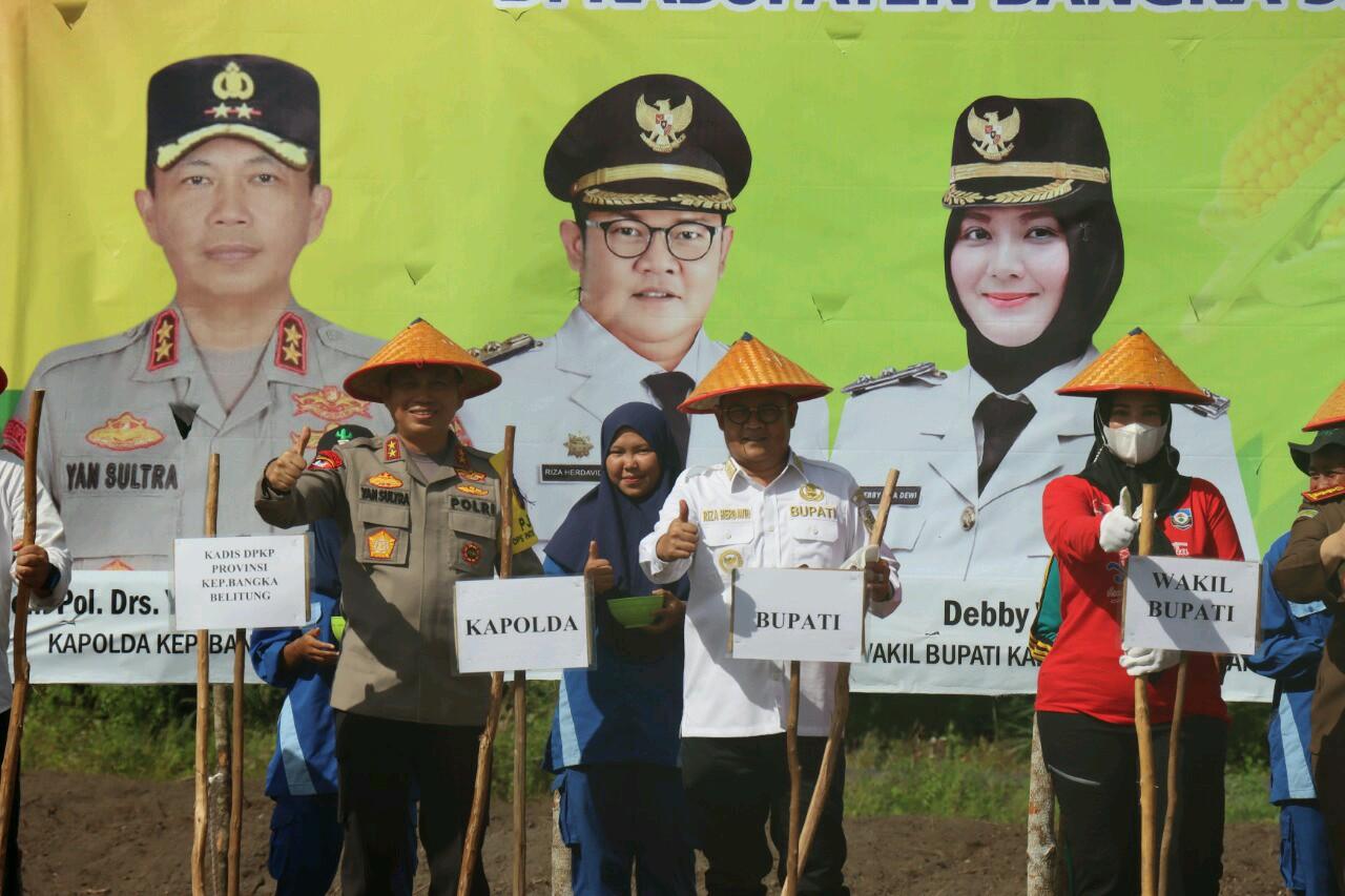 PANGKALPINANG, bangkaterkini.com - Kapolda Kep. Bangka Belitung Irjen Pol Yan Sultra melakukan penanaman bibit jagung perdana di lahan yang berada di kawasan perkotaan baru Desa Batu Betumpang Kecamatan Pulau Besar Kabupaten Bangka Selatan, Rabu (22/6/22).