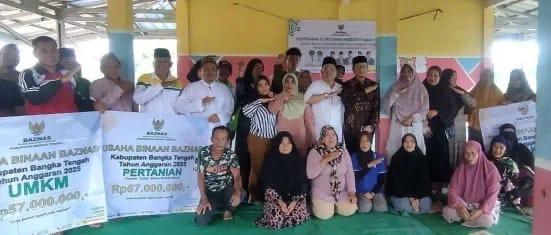 BANGKA TENGAH, BANGKATERKINI – Bupati Bangka Tengah, Algafry Rahman, bersama Wakil Bupati, Efrianda dan Ketua Badan Amil Zakat Nasional (Baznas) Bangka Tengah, Hasyim Sya'roni, menyerahkan bantuan usaha binaan Baznas kepada para mustahik, yang digelar di Saung Sawah Pelawan, Desa Namang, Jumat (18/07/2025).