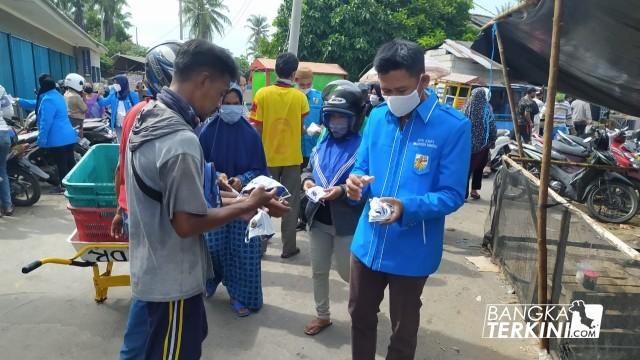 Berita Bangka Belitung - Bangka Terkini, Kabupaten Bangka --- Komite Nasional Pemuda Indonesia (KNPI) Kabupaten Bangka membagikan masker ke sejumlah warga di pasar Kite Sungailiat dan Masjid - Masjid yang akan mengadakan Sholat Ied menyambut Idul Fitri 1441 H besok.