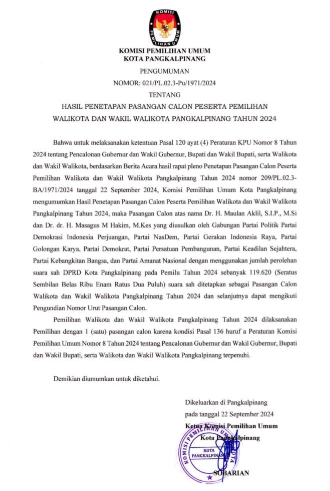 Ini Tanggal dan Regulasi Untuk Bakal Calon Perseorangan Pemilihan Ulang Walikota dan Wawako Pangkalpinang 2025