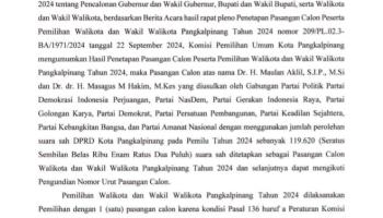 Bahwa untuk melaksanakan ketentuan Pasal 95 ayat (1) Peraturan KPU Nomor 8 Tahun 2024 tentang Pencalonan Gubernur dan Wakil Gubernur, Bupati dan Wakil Bupati, serta Walikota dan Wakil Walikota, Komisi Pemilihan Umum Kota Pangkalpinang mengumumkan Pendaftaran Pasangan Calon Walikota dan Wakil Walikota Pangkalpinang pada Pemilihan Ulang Tahun 2025 sebagai berikut: