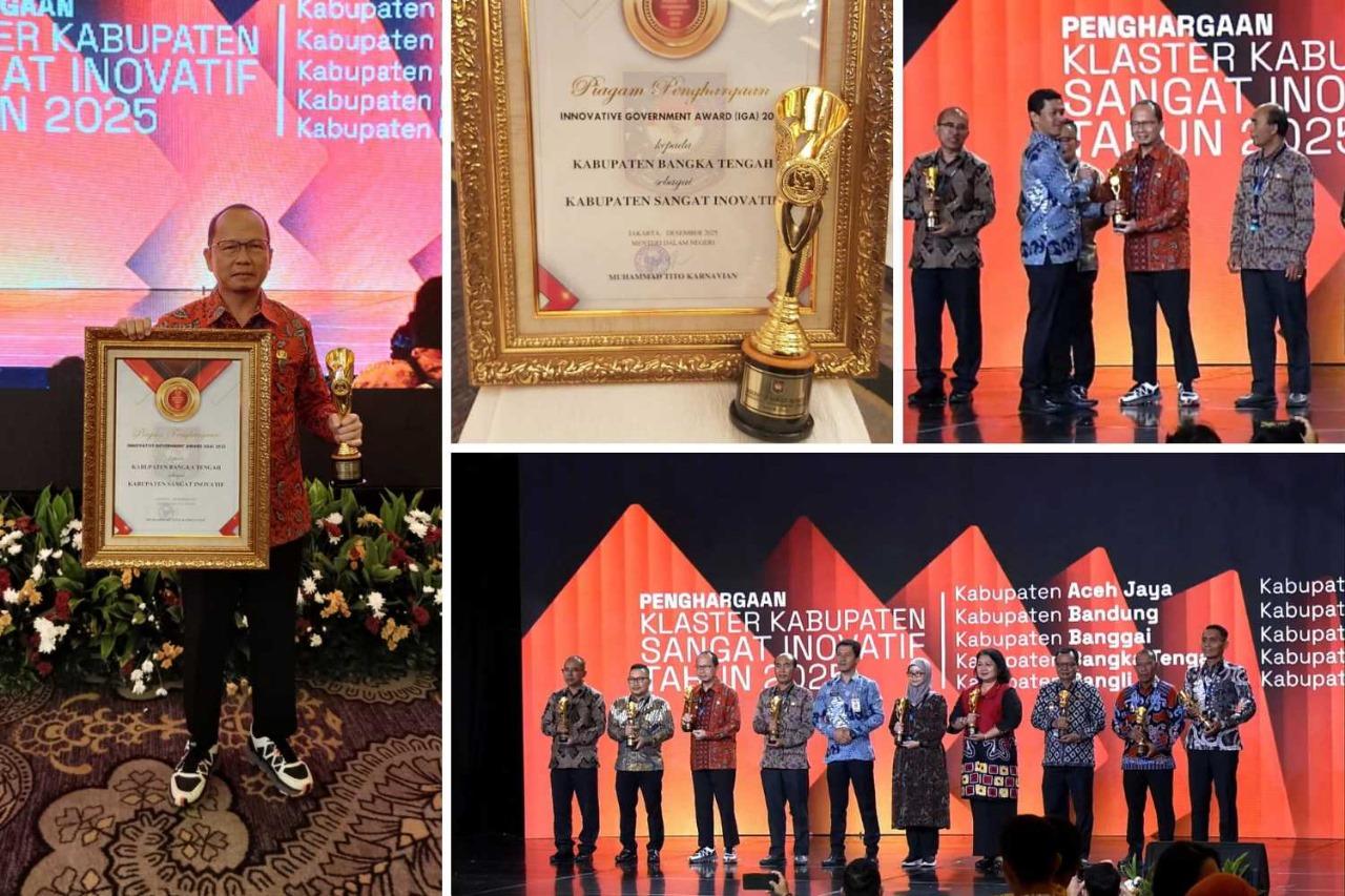 JAKARTA, BANGKATERKINI – Pemerintah Kabupaten Bangka Tengah kembali menorehkan pencapaian membanggakan di tingkat nasional. Pada penghujung tahun 2025, Pemerintah Kabupaten Bangka Tengah resmi meraih predikat Kabupaten Sangat Inovatif dalam ajang Innovative Government Award (IGA) 2025 yang diselenggarakan oleh Kementerian Dalam Negeri Republik Indonesia. Penghargaan tersebut diserahkan di Kempinski Grand Ballroom Hotel, Jakarta Pusat pada Rabu (10/12/2025).