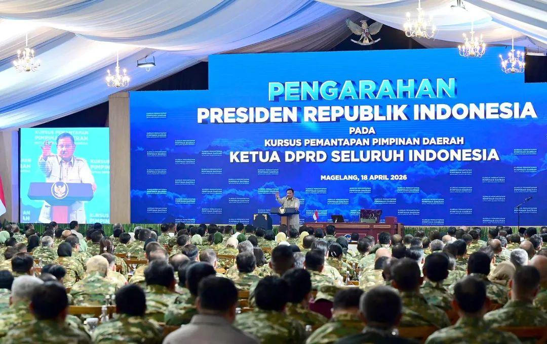 BANGKATERKINI - Presiden Prabowo Subianto memberikan pengarahan langsung kepada 503 Ketua Dewan Perwakilan Rakyat Daerah (DPRD) dari seluruh penjuru Tanah Air dalam acara Kursus Pemantapan Pimpinan Daerah (KPPD) di Lembah Tidar, Akademi Militer Magelang, Jawa Tengah, pada Sabtu, 18 April 2026.
